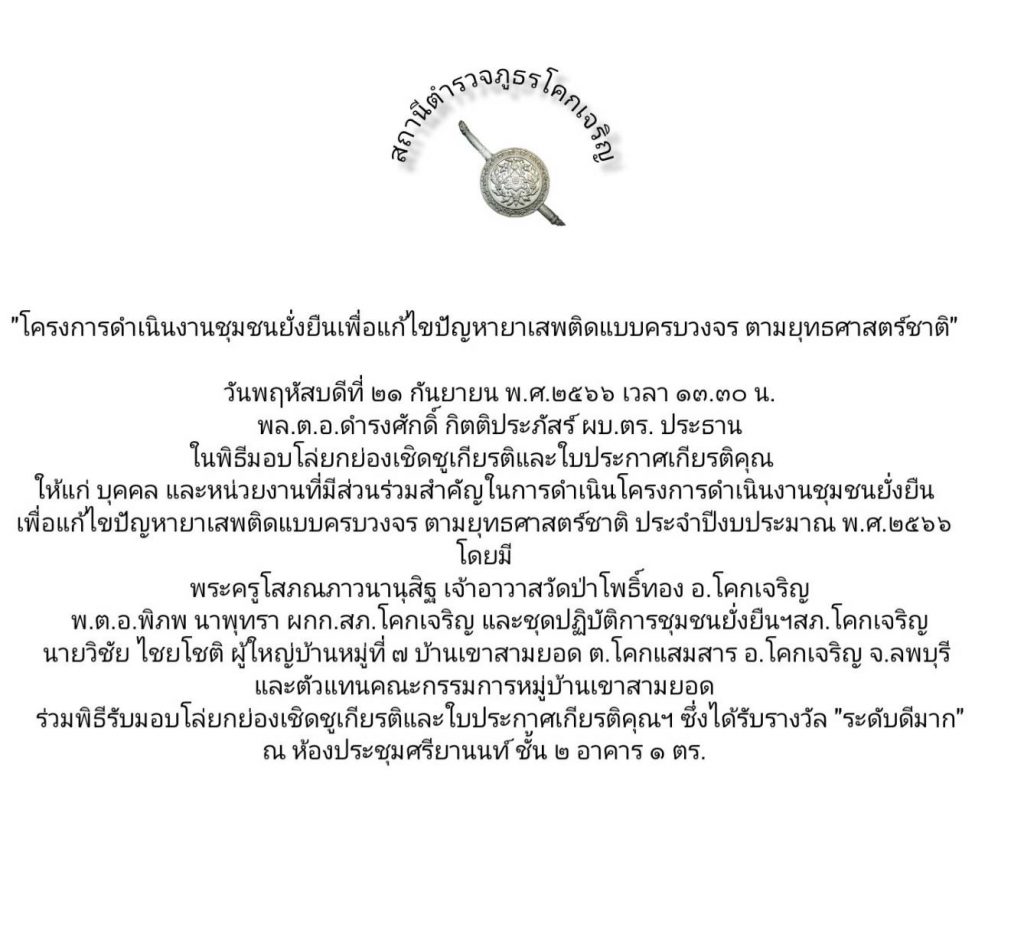 โครงการชุมชนยั่งยืนแก้ไขปัญหายาเสพติดฯ 5 มกราคม 2567 โดย admin_Khokcharoen / ข่าวประชาสัมพันธ์,ข่าวกิจกรรม,ข่าวประชาสัมพันธ์ “โครงการชุมชนยั่งยืนแก้ไขปัญหายาเสพติดแบบครบวงจร ตามยุทธศาสตร์ชาติ” FacebookFacebookXXLINELine