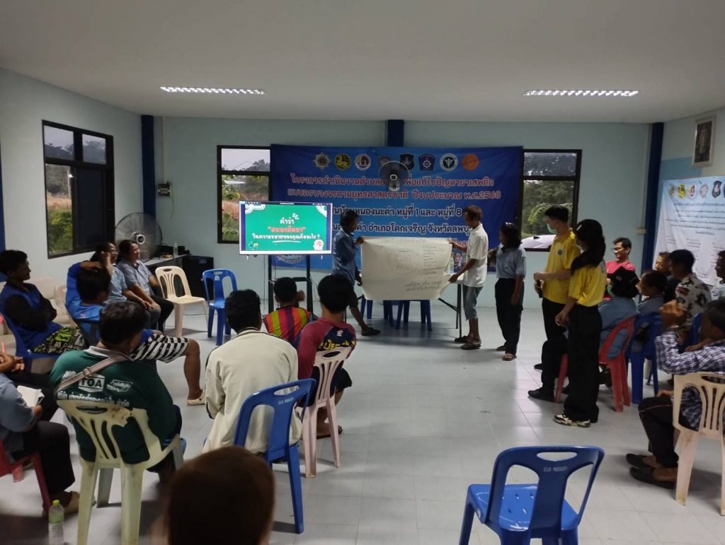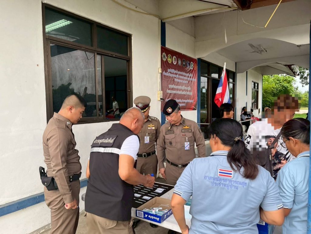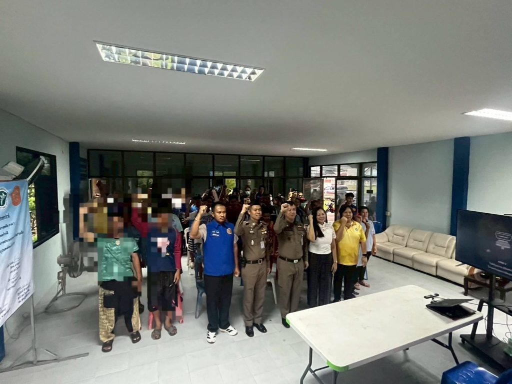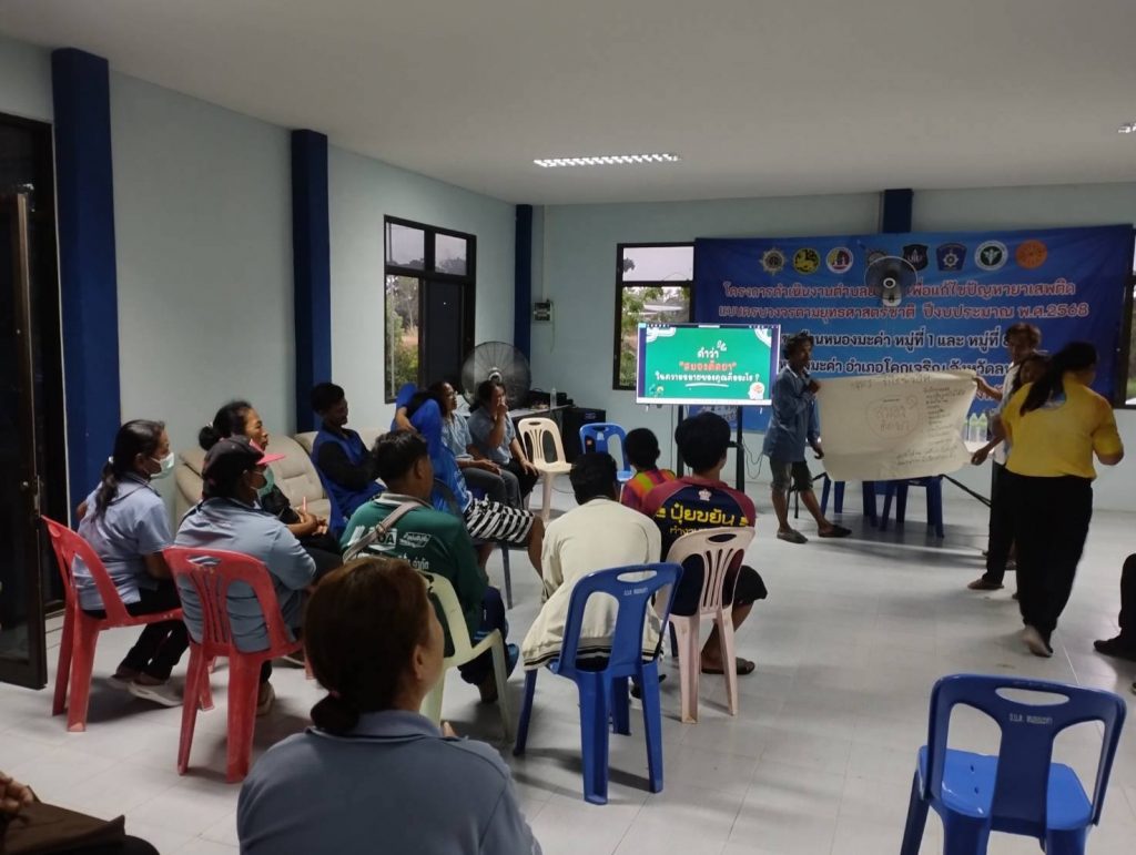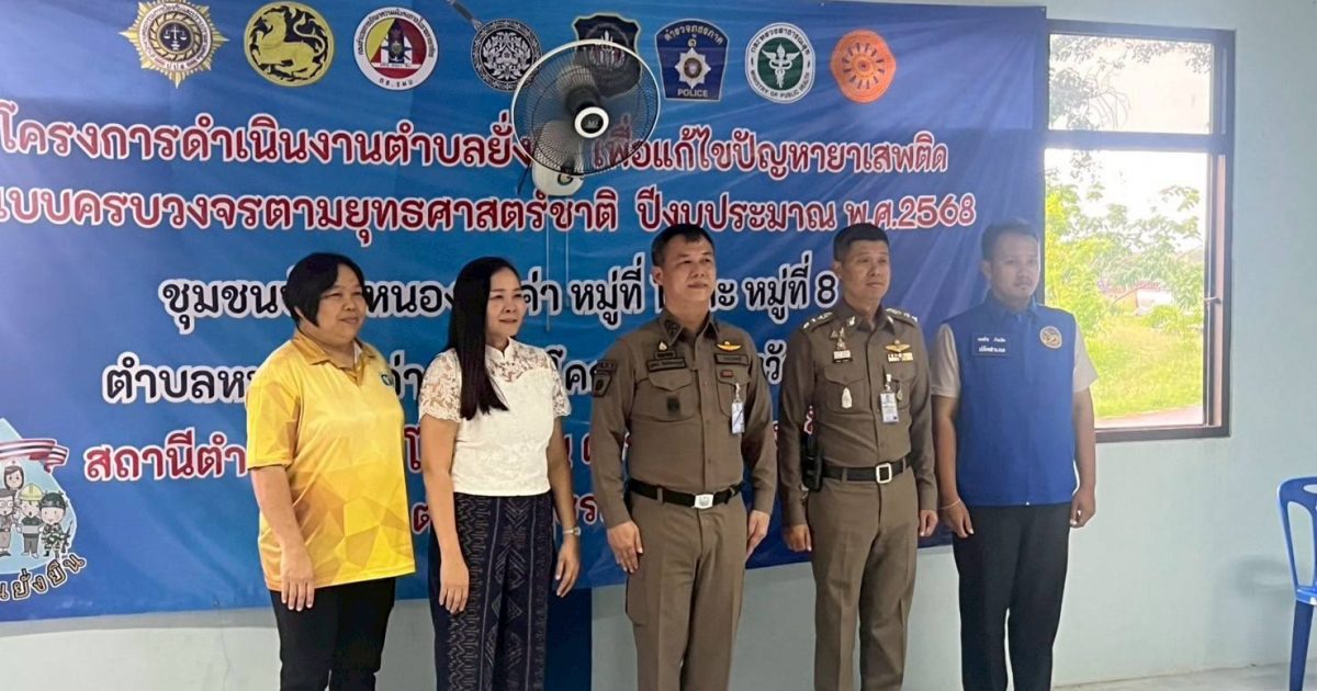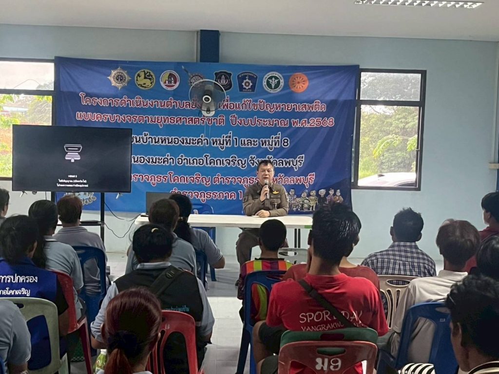 โครงการดำเนินงานตำบลยั่งยืน เพื่อแก้ไขปัญหายาเสพติดแบบครบวงจร ตามยุทธศาสตร์ชาติฯ วันที่ 15 พ.ค.2568 เวลา 17.00 น. โดยการนำของ พ.ต.อ.พิภพ นาพุทรา ผกก.สภ.โคกเจริญ พร้อมชุดปฏิบัติการฯ ได้ร่วมกับภาคีเครือข่าย ประกอบด้วยฝ่ายปกครอง อ.โคกเจริญ นำโดย ว่าที่ ร.ต.คมสัน กันภัย ปลัดอำเภอโคกเจริญ และเจ้าหน้าที่ฝ่ายปกครอง รพ.โคกเจริญ นำโดย น.ส.ปราณี ตินพ พยาบาลวิชาชีพชำนาญการ และเจ้าหน้าที่สาธารณสุขอำเภอโคกเจริญ นำโดย นางนันทวัน ขวัญสุข รองสาธารณสุขอำเภอโคกเจริญ และเจ้าหน้าที่ ฝ่ายท้องถิ่น อบต.หนองมะค่า กำนัน/ผู้ใหญ่บ้านและคณะกรรมการคุ้มชุมชนบ้านหนองมะค่า หมู่ที่ 1,8 และ 9 ต.หนองมะค่า หมู่ 4 ต.วังทอง และหมู่ 11 ต.ยางราก นำผู้เข้าร่วมโครงการ จำนวน 42 คน ร่วมกิจกรรมบำบัด CBTx โดยมี พ.ต.อ.นิทัศน์ จิตตวิทยานุกูล รอง ผบก.ภ.จว.ลพบุรี ตรวจเยี่ยมให้คำแนะนำและ เป็นกำลังใจผู้เข้ารับการบำบัด เจ้าหน้าที่ และคณะกรรมการคุ้ม ตรวจคัดกรอง ตรวจสุขภาพ วัดความดัน ผู้เข้ารับการบำบัด โดยเจ้าหน้าที่สาธารณสุข อ.โคกเจริญ บรรยายให้ความรู้เกี่ยวกับโทษของยาเสพติดในหัวข้อ “สมองติดยา” โดยวิทยากรเจ้าหน้าที่ฝ่ายจิตเวช โรงพยาบาลโคกเจริญ ตรวจปัสสาวะผู้เข้ารับการบำบัดครั้งที่ 5 ณ ศูนย์ปฏิบัติการกิจกรรมบำบัด หมู่ 8 ตำบลหนองมะค่า(หลังศาลเจ้าพ่อขุนด่านสีแดง) อำเภอโคกเจริญ จังหวัดลพบุรี