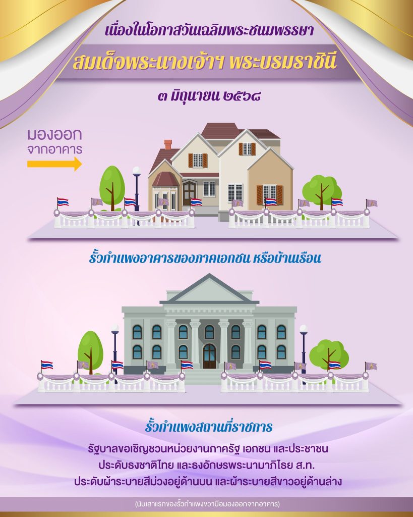 รัฐบาลขอเชิญหน่วยงานภาครัฐ ภาคเอกชน และประชาชน จัดตั้งโต๊ะหมู่ประดิษฐานฉายาลักษณ์สมเด็จพระนางเจ้าฯ พระบรมราชินี พร้อมเครื่องราชสักการะ ประดับธงชาติไทยคู่กับธงพระนามาภิไธย ส.ท. และประดับผ้าระบายสีม่วงร่วมกับผ้าระบายสีขาวตามหน่วยงาน อาคาร บ้านเรือน ตลอดเดือนมิถุนายน ๒๕๖๘ สามารถดาวน์โหลดพระฉายาลักษณ์ได้ที่เว็บไซต์กรมประชาสัมพันธ์ https://www.prd.go.th #ทรงพระเจริญ #วันเฉลิมพระชนมพรรษา #๓มิถุนายน๒๕๖๘ #กิจกรรมเฉลิมพระเกียรติฯ