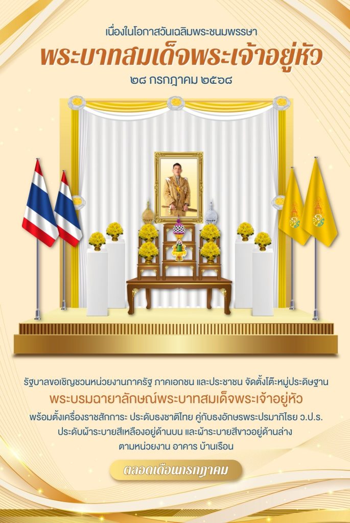 เนื่องในโอกาสวันเฉลิมพระชนมพรรษาพระบาทสมเด็จพระเจ้าอยู่หัว ๒๘ กรกฎาคม ๒๕๖๘ รัฐบาลขอเชิญหน่วยงานภาครัฐ ภาคเอกชน และประชาชน จัดตั้งโต๊ะหมู่ประดิษฐานพระบรมฉายาลักษณ์พระบาทสมเด็จพระเจ้าอยู่หัว พร้อมเครื่องราชสักการะ ประดับธงชาติไทยคู่กับธงพระนามาภิไธย ว.ป.ร. และประดับผ้าระบายสีเหลืองร่วมกับผ้าระบายสีขาวตามหน่วยงาน อาคาร บ้านเรือน ตลอดเดือนกรกฎาคม ๒๕๖๘ สามารถดาวน์โหลดพระฉายาลักษณ์ได้ที่เว็บไซต์กรมประชาสัมพันธ์ https://www.prd.go.th